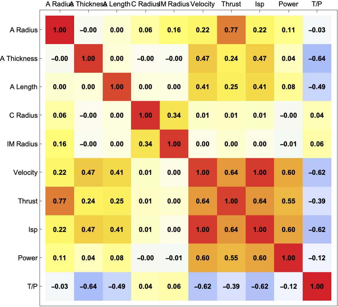 Having defined the simulation, I then combined them all into one function and ran parameter sweeps over various anode radius, thickness, height, grid spacing, magnet radius, and channel length across deployable and idealized ranges, generating a correlatioin matrix between parameters and performance for the gridded ion and hall effect thruster respectively.